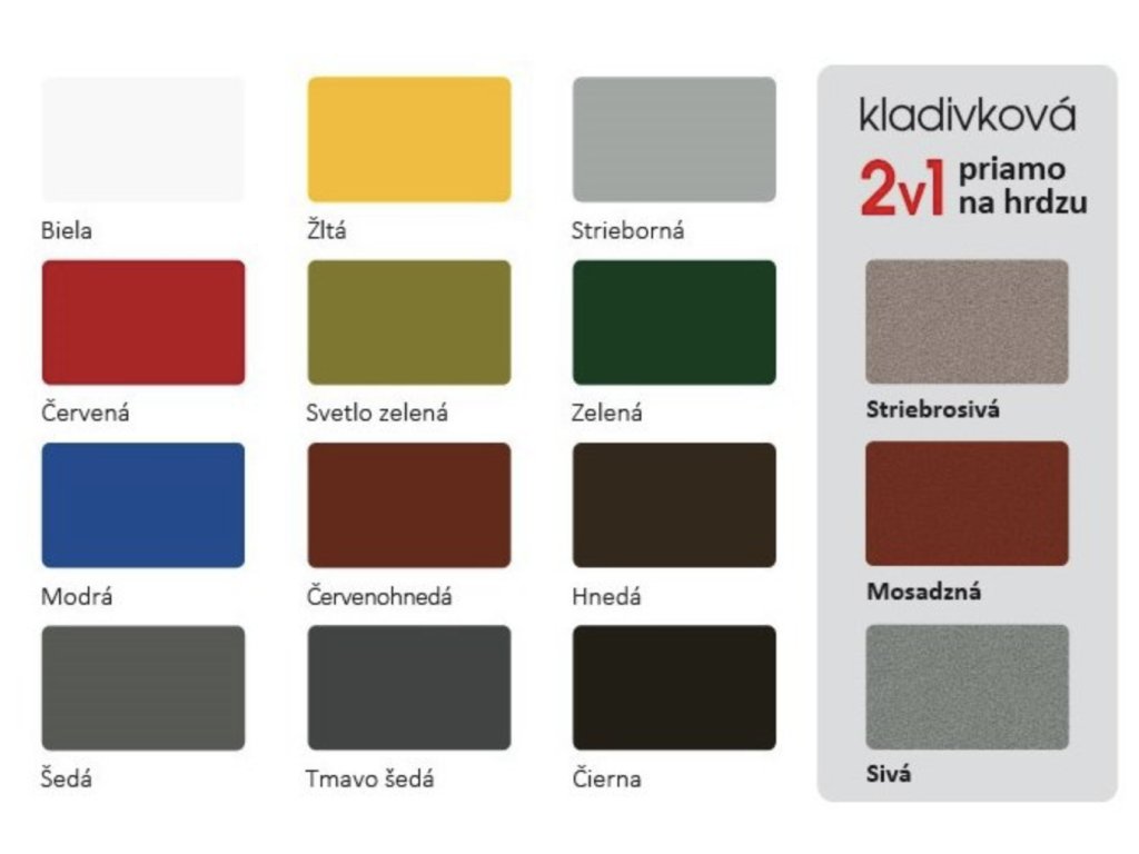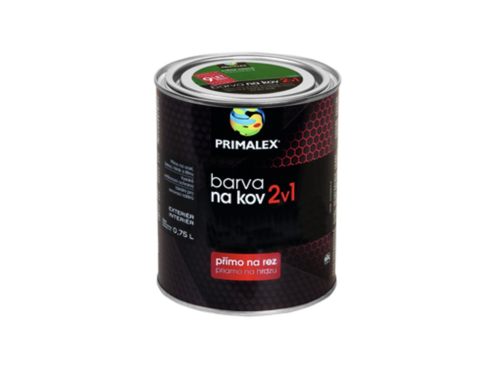 Primalex Farba na kov 2v1 kladivková je jednozložková syntetická farba určená k priamym ochranným náterom oceľových, železných, hliníkových a liatinových povrchov vo vonkajšom aj vnútornom prostredí bez potreby použitia základných farieb. Obzvlášť vhodná na obnovu náterov na skorodovaných podkladoch. Dokonalá priľnavosť k podkladu a vysoký stupeň antikoróznej ochrany zaručujú dlhodobú životnosť náterov. Príjemný pololesklý finálny vzhľad ponúka aj dosiahnutie zaujímavých dekoratívnych tzv „kladívkových“ efektov spolu s vysokou odolnosťou voči mechanickému poškodeniu.